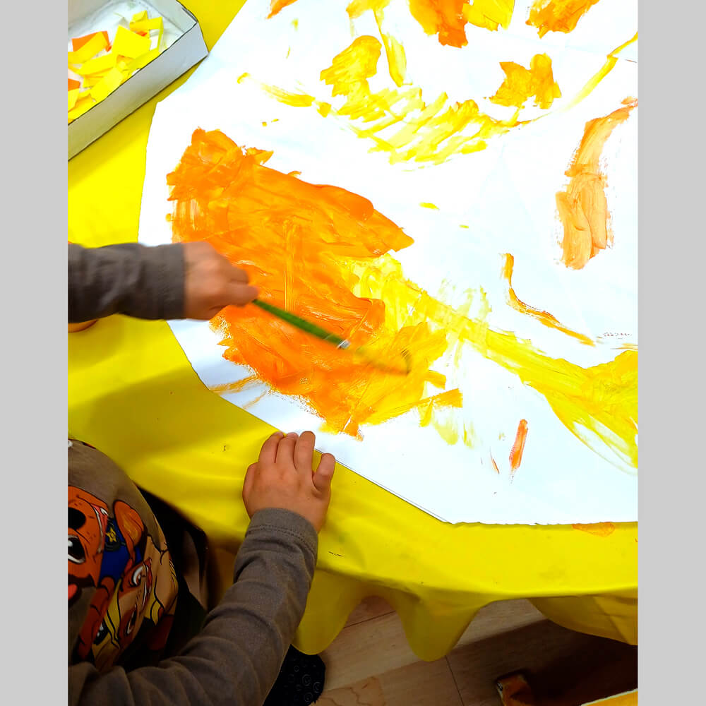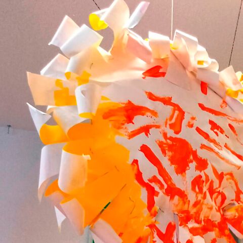 Grosse runde Papiere. Pro Sonne zwei. Farben, Pinsel, Scheren, Postiche bereithalten. Platz für grosse Formate schaffen!