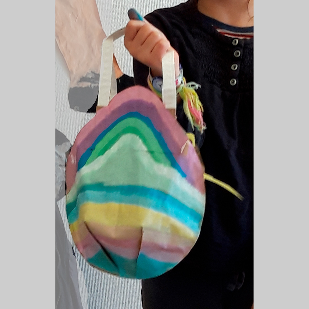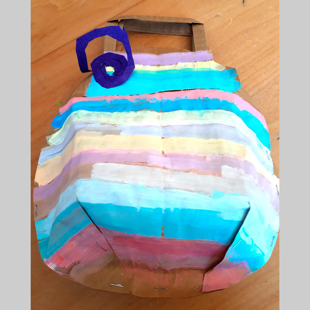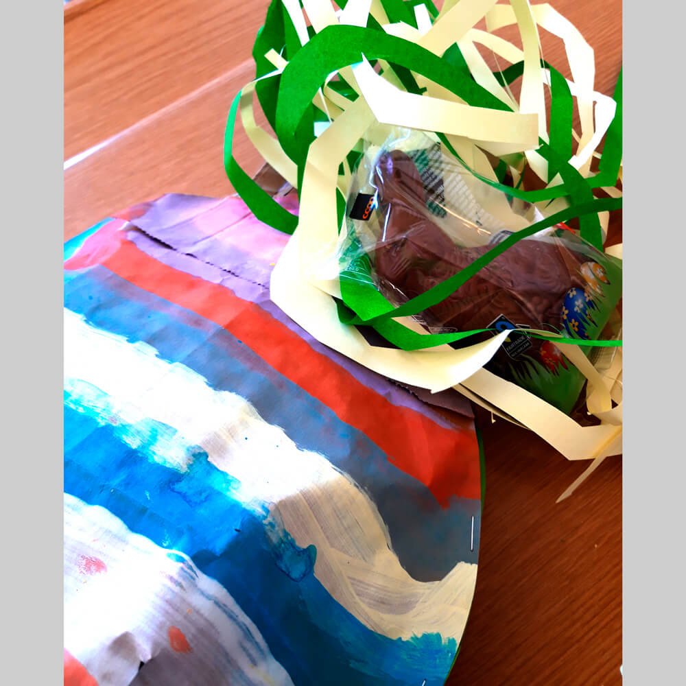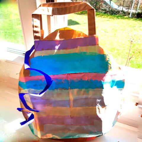 Aus einer Papiertragetasche entsteht ein Osterei. Das Besondere daran: Die Tragegriffe bleiben bestehen, die Tasche wird in Eiform ausgeschnitten und schon wird sie zum Trageosterei. Zur Dekoration können Muster gemalt werden. Streifen oder einfache Muster wie zum Beispiel in der Monatsidee «erste Muster». Oder wie in der letzten Monatsidee «Traumsonne» einfach Pinselstriche oder Tupfen malen. Hauptsache, die Farben machen Freude. Auch das Trage-Osterei, wenn vielleicht mit einer Überraschung gefüllt, wird sicher Freude machen!