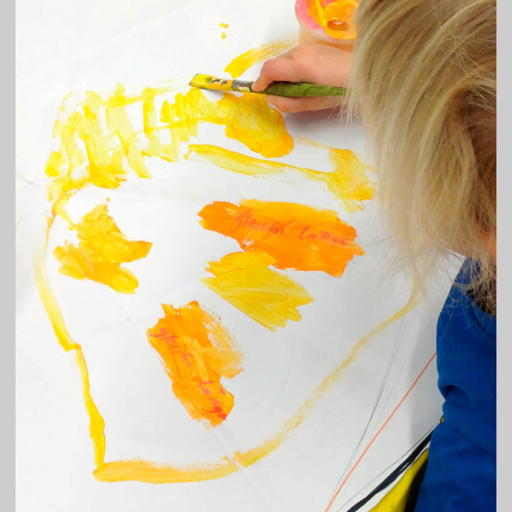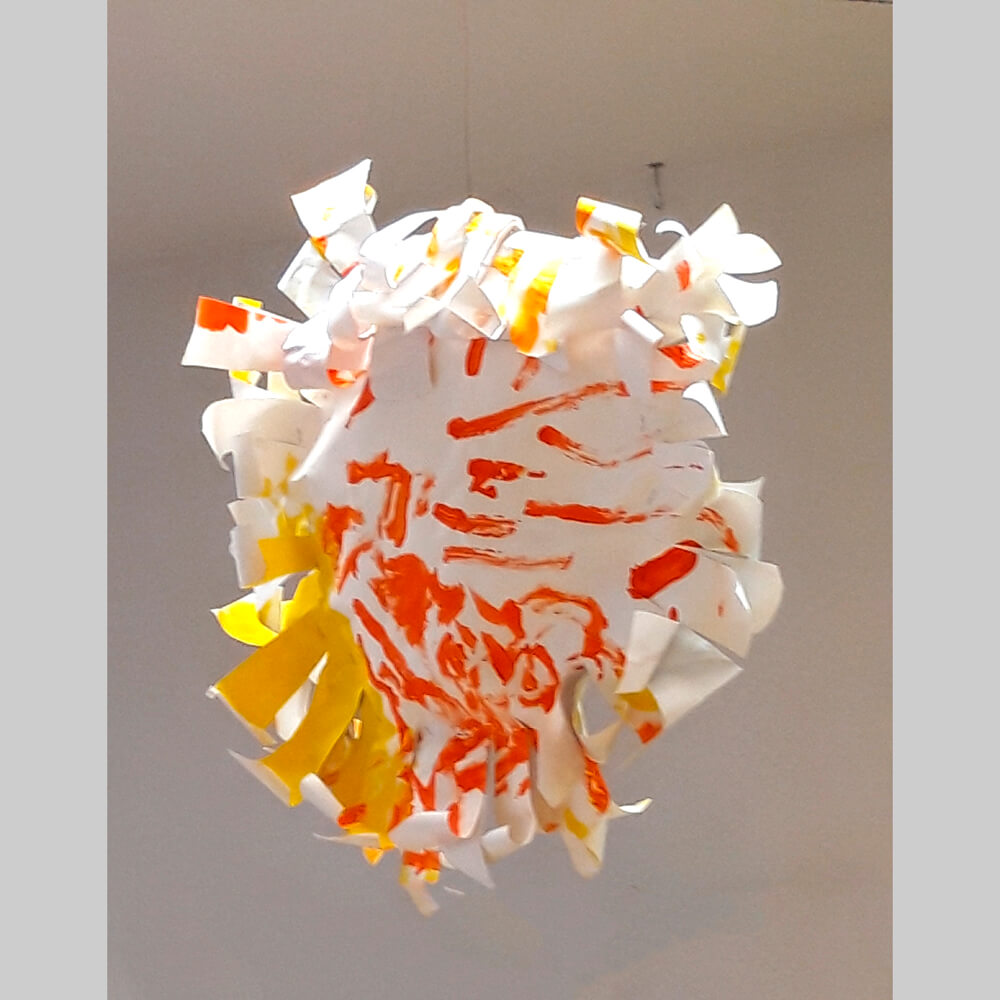 Wie die Beispiele von Spielgruppenkindern zeigen, kann bei dieser Kreation eigentlich nichts schiefgehen. Die Sonnen wirken immer warm und fröhlich, unabhängig von der Differenziertheit des Musters. Das Schülerbeispiel ist durch gemeinsames erstes Malen mit Flachpinsel am selben Objekt entstanden. Gemeinsam ein so grosses Format zu malen ist eine spannende Erfahrung und kann stolz machen. Mitgemalt zu haben an der Raumdekoration für gemeinsame Räume ist ein Erlebnis, welches die Selbstwirksamkeit fördert. Da auch ungeübte Kinder mit einem Pinsel etwas malen können, ist es auch jedem möglich, am Erfolg teilzuhaben. Das tut gut und animiert für weitere Experimente mit Couachefarben.