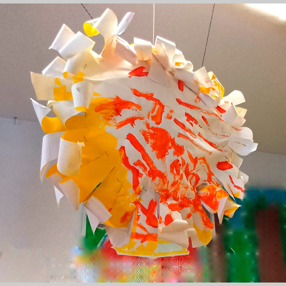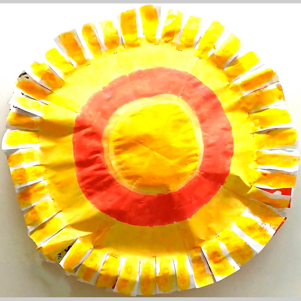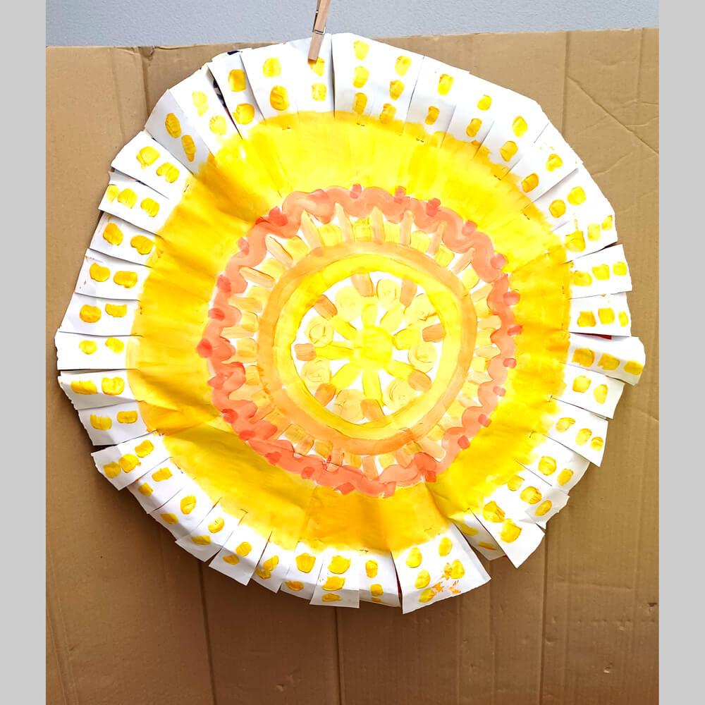 Eine einfache Sonne spiegelt als Dekoration die Freude am kommenden Frühling wieder. Aus grossen Papieren werden zwei Kreise ausgeschnitten und nach Lust und Laune mit sonnigen Farben bemalt. Die Beispielsonne ziert erste Pinselstriche. Mit Älteren Kindern können auch Sonnen Muster entstehen. Eine entspannende, grosszügige und wirkungsvolle Gemeinschafts-oder Einzelarbeit.