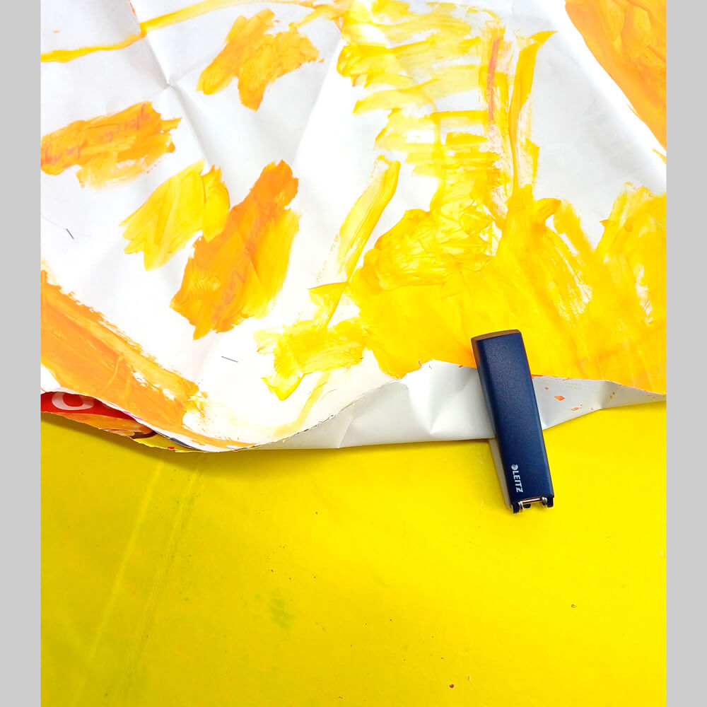 Grosse Papiere in Weiss, zum Beispiel Volg-Plakate, Restpapiere einer Druckerei, oder für kleinere Sonnen eine Papiertasche mit weissem Inneren.