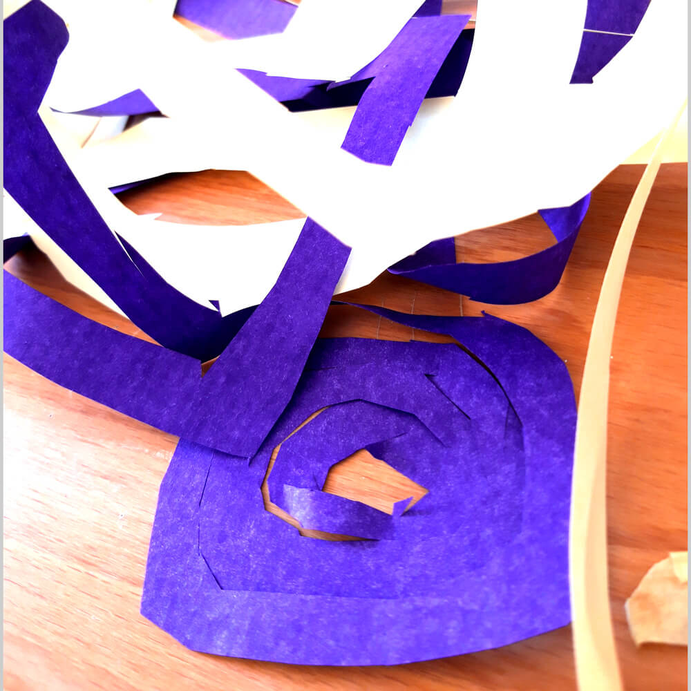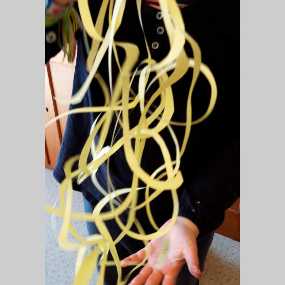 Ein grösseres Format selber bewältigen zu können macht stolz und gibt das Gefühl, richtig Arbeit geleistet zu haben. Etwas Besonderes zu malen, was auch zuhause Aufmerksamkeit bekommt, wirkt motivierend, etwas Schönes zu malen. Mit dem rundherum Aufschneiden eines Papieres erlebt man eine tolle Überraschung, weil, je schmaler geschnitten wird, desto unerwartet lang werden diese Papierschnüre. Das fasziniert und begeistert.
