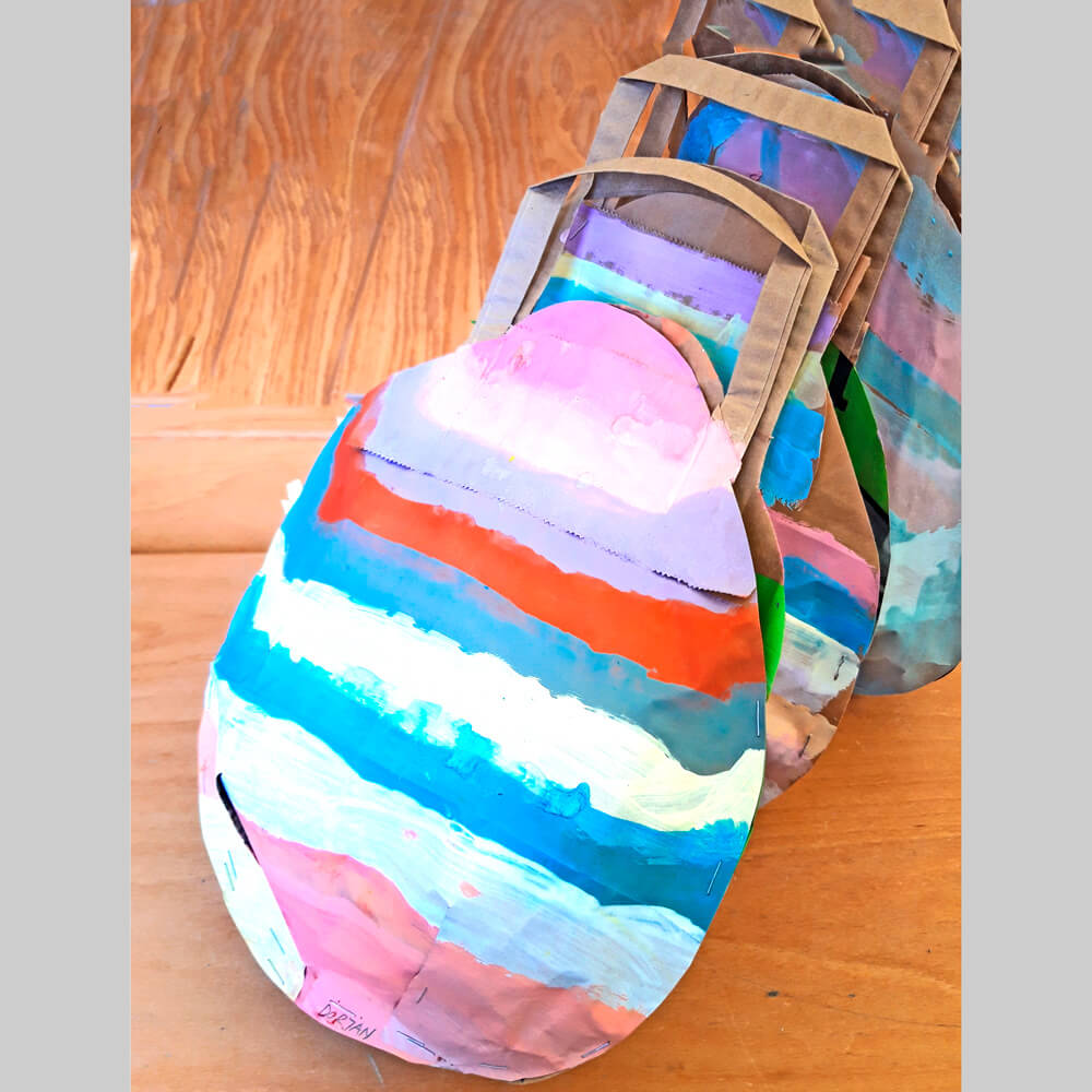 Eier-Form aus einer Tragetasche schneiden, beidseitig bemalen und zusammentakkern.