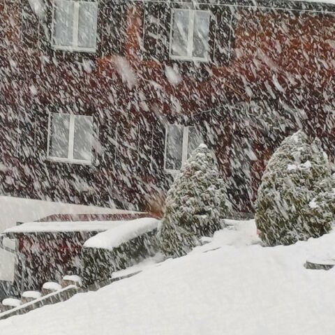 So sieht die Fassade meines Nachbarhauses im Schnee aus.