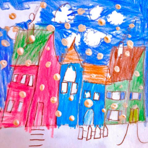 Zur Inspiration und zur Freude Häuser zeichnend erfinden und ausmalen. Sich Formen wie Dächer, Fenster oder Türen ausdenken können. Das Malen mit Farbstiften als Technik zur Gestaltung anwenden können. Wetter, in diesem Fall Schneefall, über das ganze Bild verteilt darstellen und erleben können.