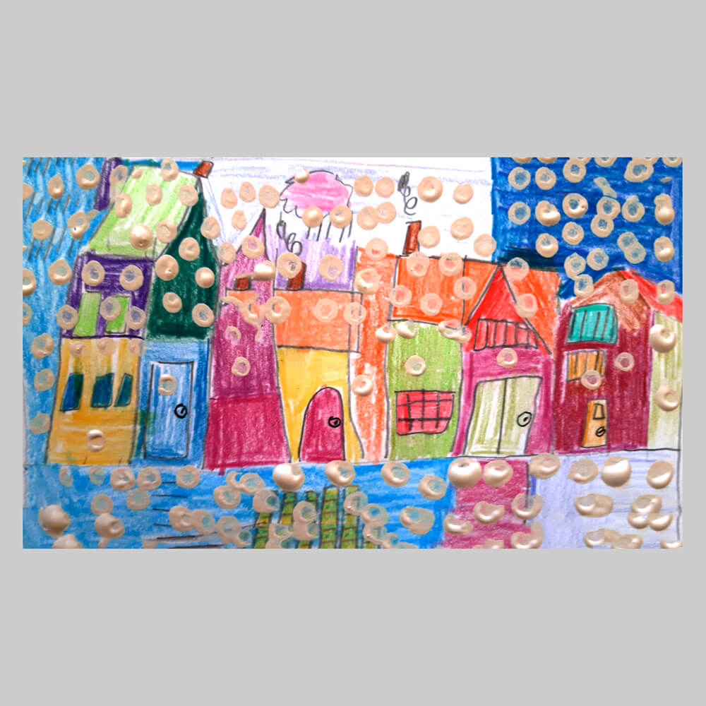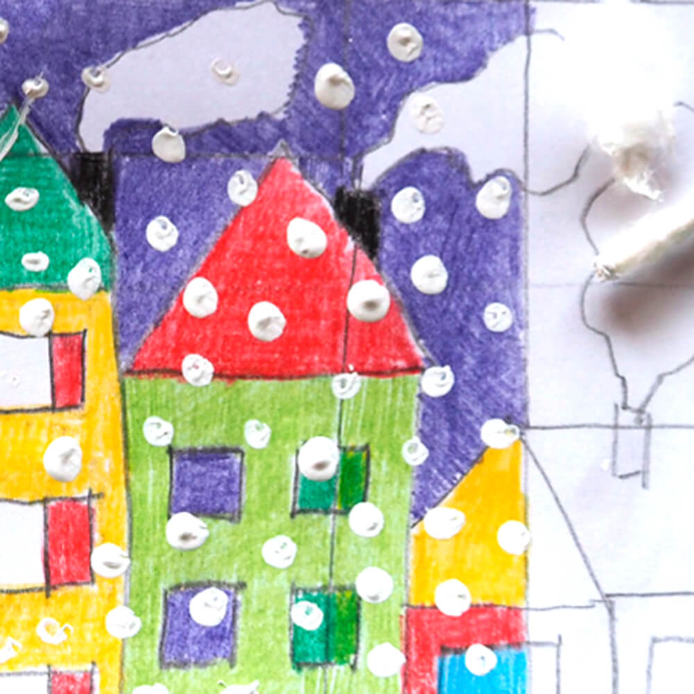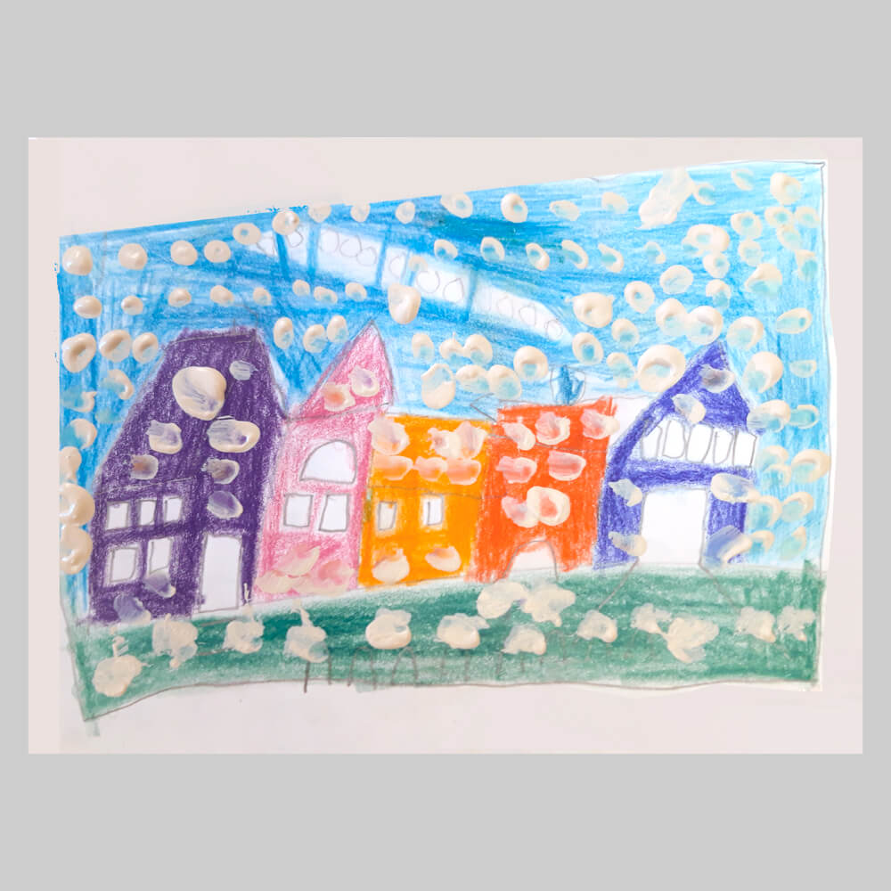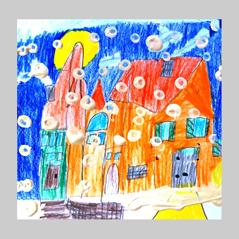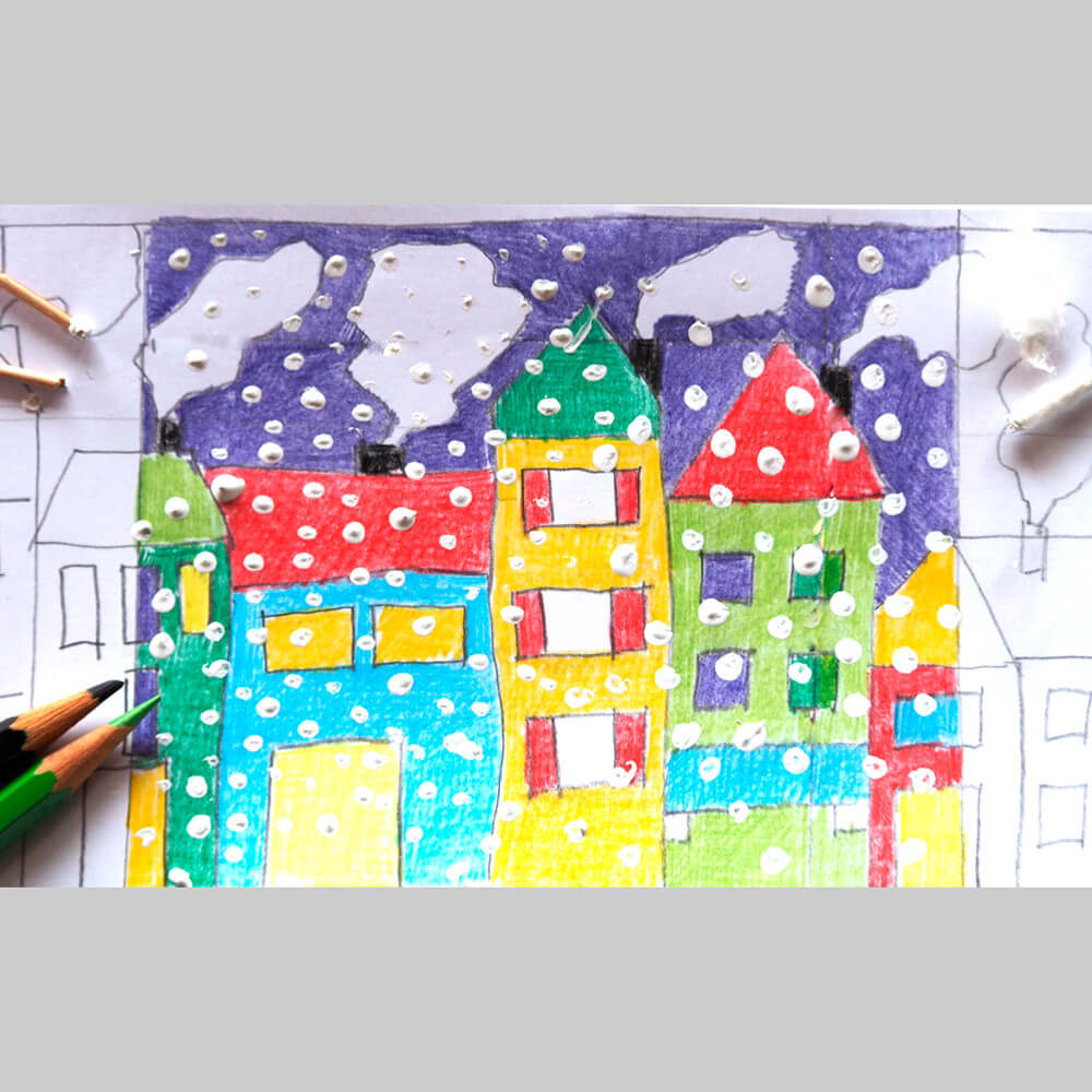 Farbstifte sind ein sehr schönes Mittel zum Malen. Um auch bei Ungeübteren ein anschauliches Resultat zu bekommen, braucht es ein wenig Geduld. Ein kleiner Ausschnitt der zu bewältigen ist, oder grosszügige weisse Flächen, wie Rauch, Fenster oder Wolken verkleinern die zu malende Fläche. So erwacht durch das freudige Ausmalen die selber ausgedachte Häuserreihe zum Leben. Die aufgetupften Schneeflocken verbinden alles und schaffen Stimmung. Eine auch für ältere Schülerinnen und Schüler spannende Idee.
