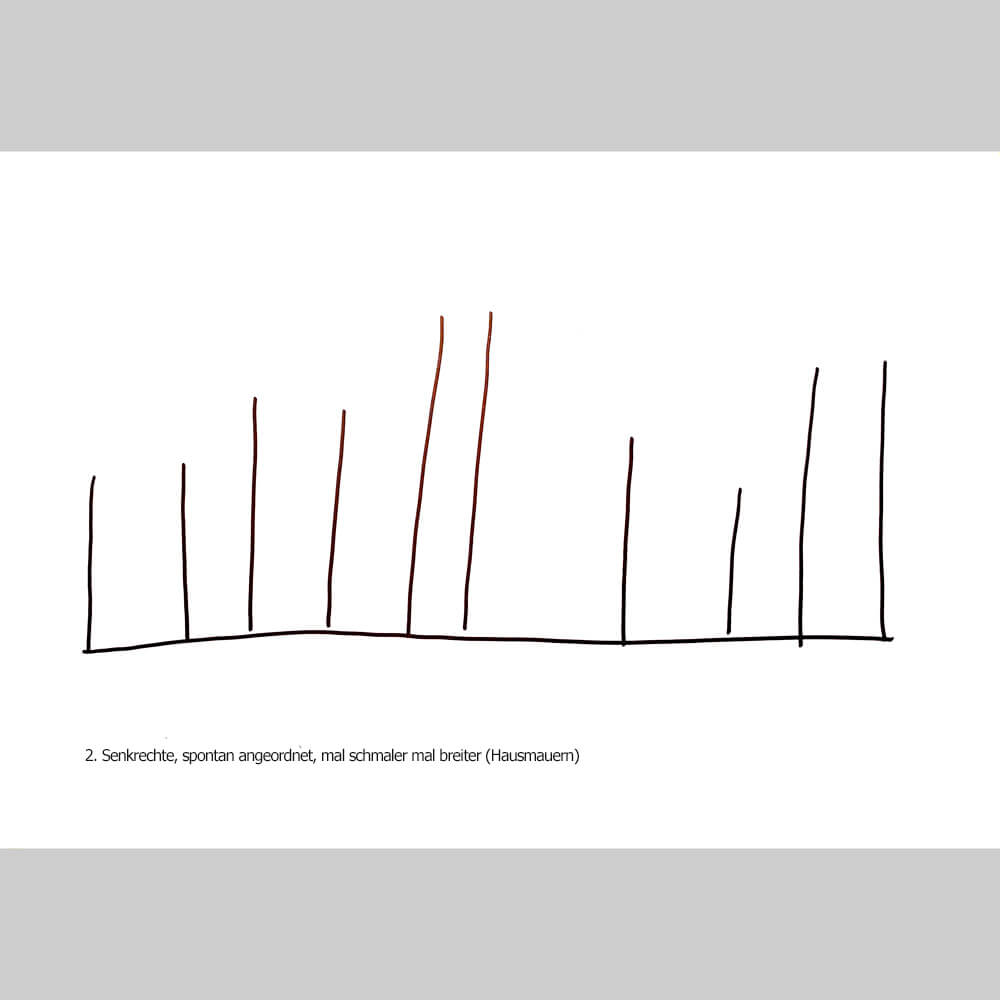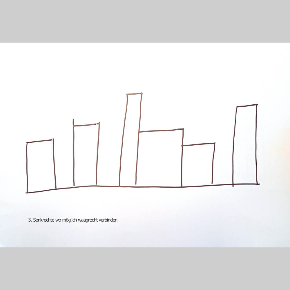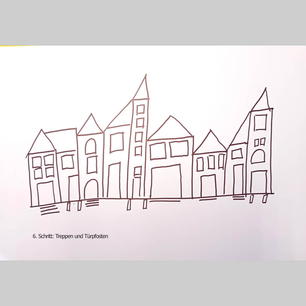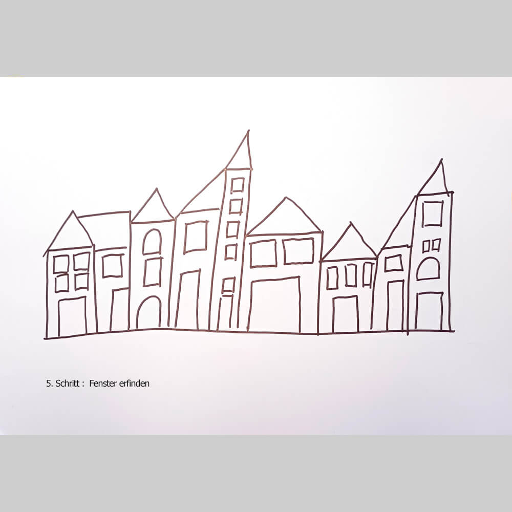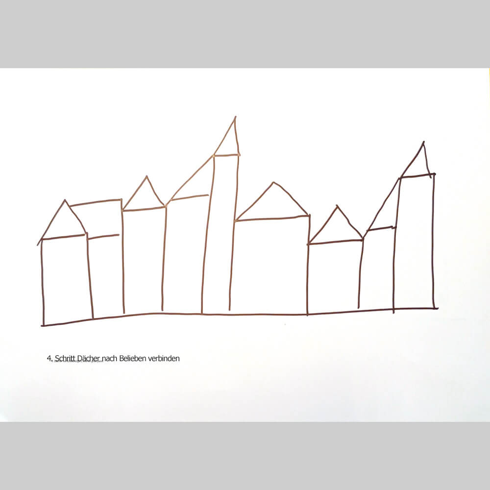 Das Zeichnen der Häuser Schritt für Schritt gemäss Anleitung vorzeigen.